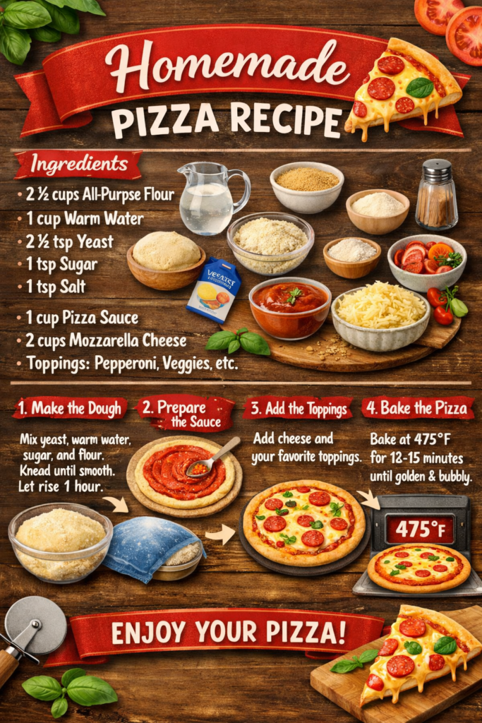 🍕✨ HOMEMADE PIZZA RECIPE 🌟 Ingredients 🍞 2 cups all-purpose flour (maida) 🧂 1 tsp salt 🍬 1 tsp sugar