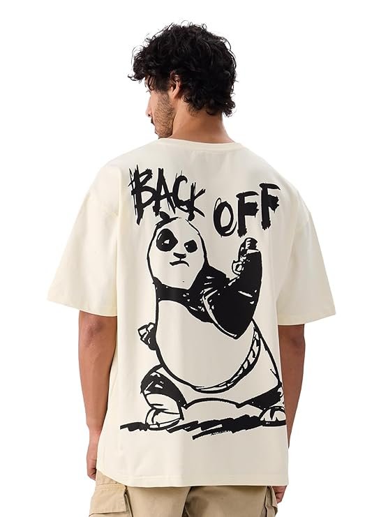 The Rouled Official Kung Fu Panda: Back Off Men and Boys Short Sleeve Round Neck Off White Graphic Printed Cotton Oversized T-Shirts